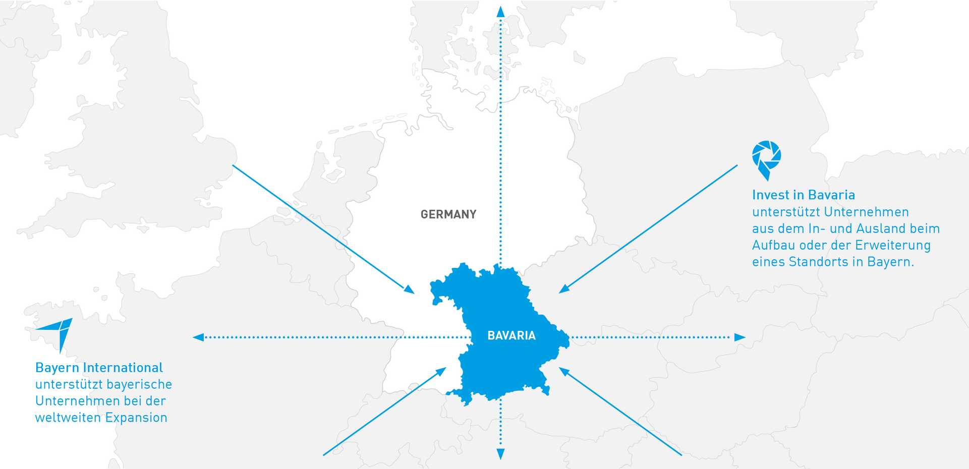 Die Bayern International GmbH wurde 1996 vom Freistaat Bayern im Rahmen der „Offensive Zukunft Bayern“ gegründet und nimmt seither eigenverantwortlich operative Aufgaben im Rahmen der bayerischen Außenwirtschaftsförderung (Marke „Bayern International“) und der bayerischen Ansiedlungsförderung (Marke „Invest in Bavaria“) wahr.